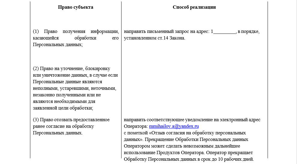 mmihailov.a@yandex.ru9.2. В данном документе будут отражены любые изменения политики в отношении обработки персональных данных Оператором. Политика действует бессрочно до замены ее новой версией.